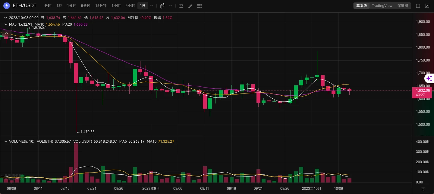 OKX 行情 数据显示,上周 ETH 一度上涨至 1780 USDT,周内收于 1632 USDT,环比下降 3% 。