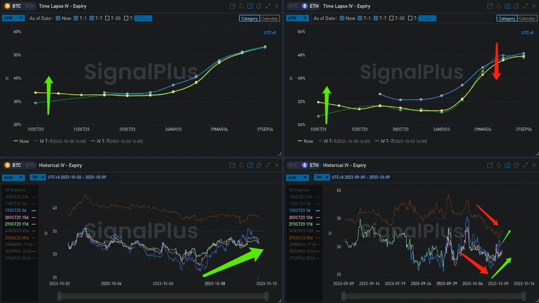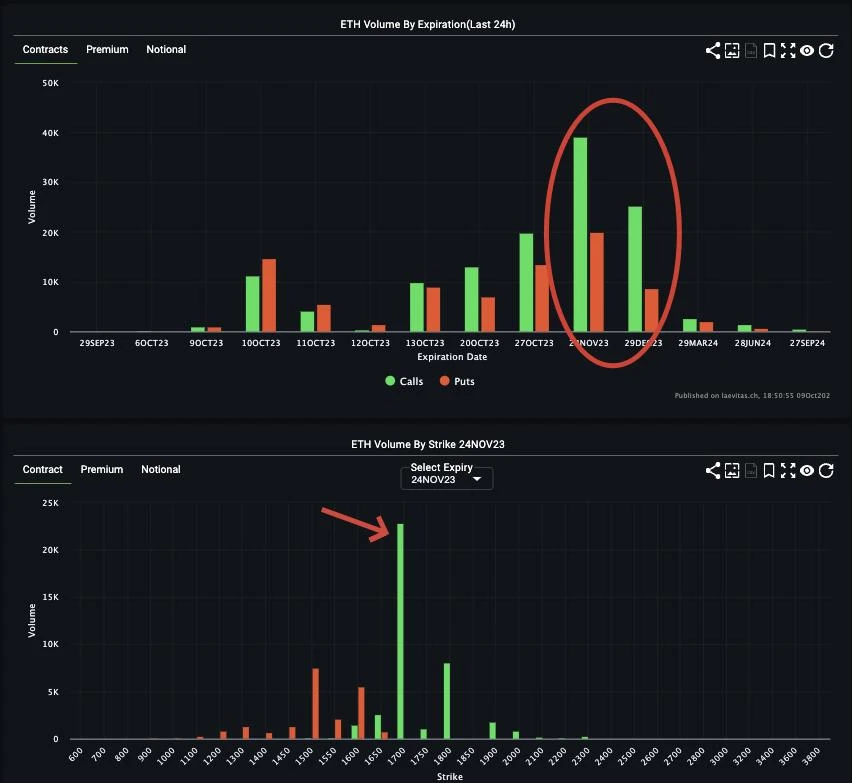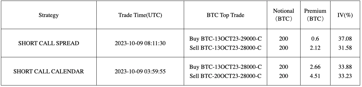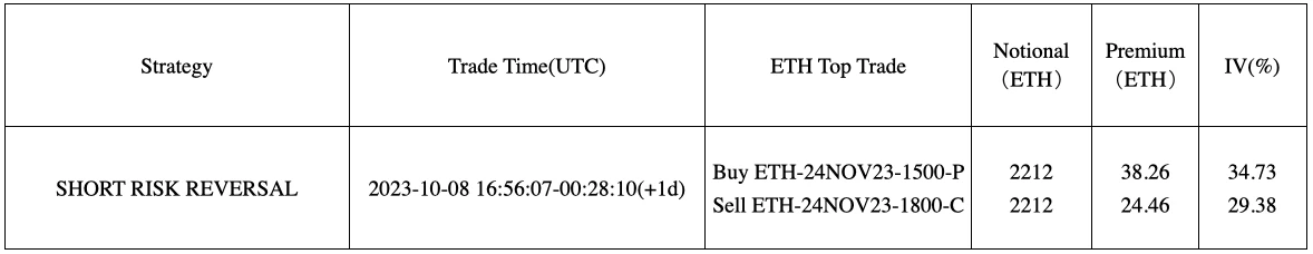 周末大宗交易相对平淡。在期权链市场,BTC 的成交集中在 28000-C 和 30000-C 上,进一步分析得出,其成因主要是 一周内 28000-C 附近的 Call 遭到大量抛售 ,而 次周(20 OCT 23)的 30000-C 又被大量买入建仓 ,形成了类似日历三角价差的 FLow。ETH 的成交分布向中期转移, 买入十一月底 1700-C 看涨期权 交易成为市场热点,据统计,该合约在过去一日累计买入量达到 20.57 K ETH,OI 增长接近 19 K。