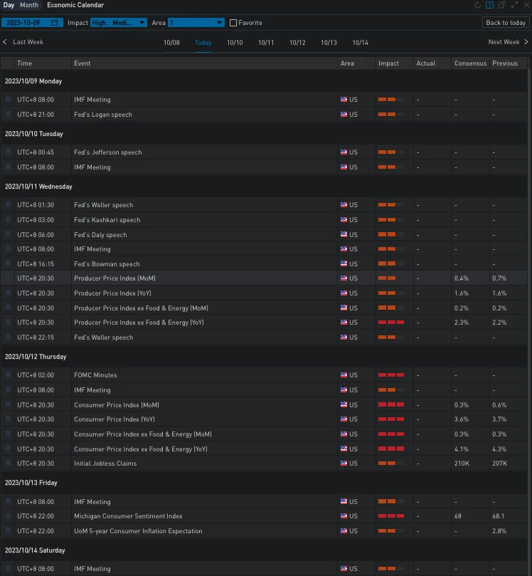 上周五(6 Oct)公布的 非农数据几乎是预期的 2 倍 ,表明 美国就业市场依然强劲 ,数据公布后,美债一度拉升超过 10 个基点,随后回吐大部分涨幅,目前 10 年期国债收益率处于 4.73 价格附近。 美国三大股指扭转了非农带来的早盘颓势(跌幅约 1% )实现全面上涨 ,其中,纳斯达克涨幅达 1.60% ,标普 500 上涨 1.18% ,道琼斯指数涨 0.87% 。受巴以冲突影响, 市场避险情绪升温 ,黄金与原油价格大幅高开。本周可重点关注周四晚(12 Oct 08.30 pm UTC+ 8)美国消费者物价指数数据,市场普遍预期 CPI 将环比上涨 0.3 – 0.4% 。