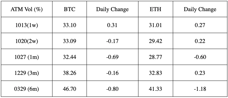 期权方面,隐含波动率相较于昨天并无显著变化。 BTC 中前端 IV 经过周末两天已顺利完成了 谷底反弹 ,重新回到 30% 以上(当前约 33% Vol)。反观 ETH,一个月内的 IV 基本都还在 30% Vol 之下,中远端和 BTC 也还有 3 ~ 5% Vol 的差距。