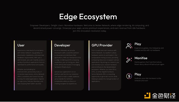 Vertex Network 将利用自身研发的边缘渲染技术与AI算力,建立一个云游戏平台,链接GameFi 并与元宇宙结合,跨界衔接其他平台的线上游戏,打破区块链公司进入Web2市场的壁垒。