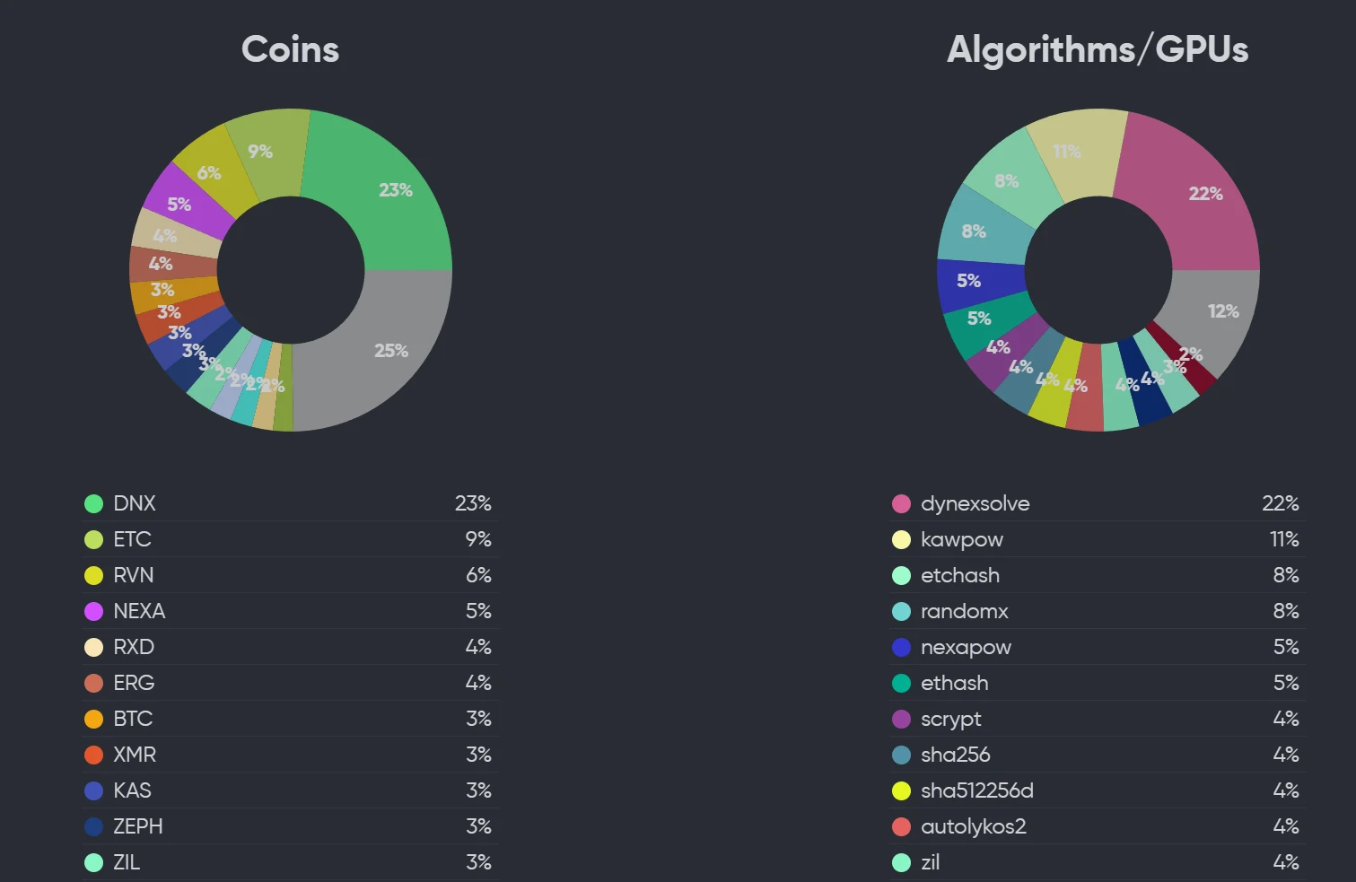 GPU 挖矿中,当前 DNX 占据最大的算力,并且从 9 月中旬至今,获得 5% 的增长,占比达到了 23% 。这是一个较高的算力占比,DNX 是继 ETH 之后,获得超过 20% 的算力的项目。