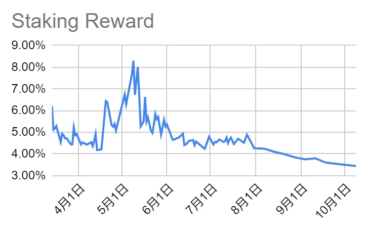 本周 ETH 质押收益率继续下降至 3.44%
