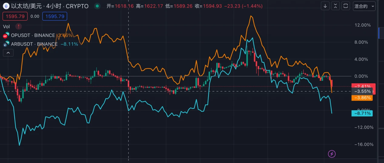 近 20 日以来 OP 与 ARB 与 ETH 的走势相关性较高。