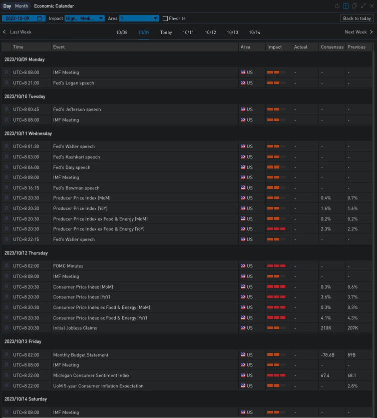 美股昨日(10 Oct)再度上演逆转走势,三大股指均实现小幅上涨。受市场避险情绪影响,现货黄金高开高走,美国国债收益率也在今日开盘后下跌,目前 10 年期美债收益率下行至 4.60 附近。此外,国际货币基金组织(IMF)发表报告称,预测 2023 年全球 GDP 增长仍为 3% , 2024 年下调至 2.9% ;而 2023 年通胀率将下调 1.3% 至 6.5% , 2024 年进一步下调至 4.1% 。