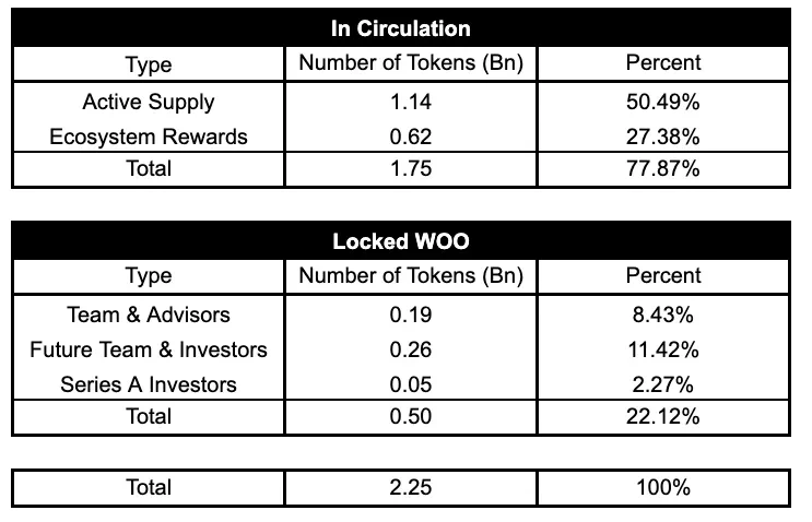 所有投资者都完全投资了,除了 A 轮投资者,他们拥有总供应的 2.27% (7100 万 WOO)。A 轮的锁定期为 3 年,有 6 个月的悬崖期。锁定开始于 2021 年 11 月 1 日。目前还有大约 13 个月,直到 A 轮投资者完全投资。值得注意的是, 2022 年 1 月,一小部分 225 万 WOO 完成了锁定期。