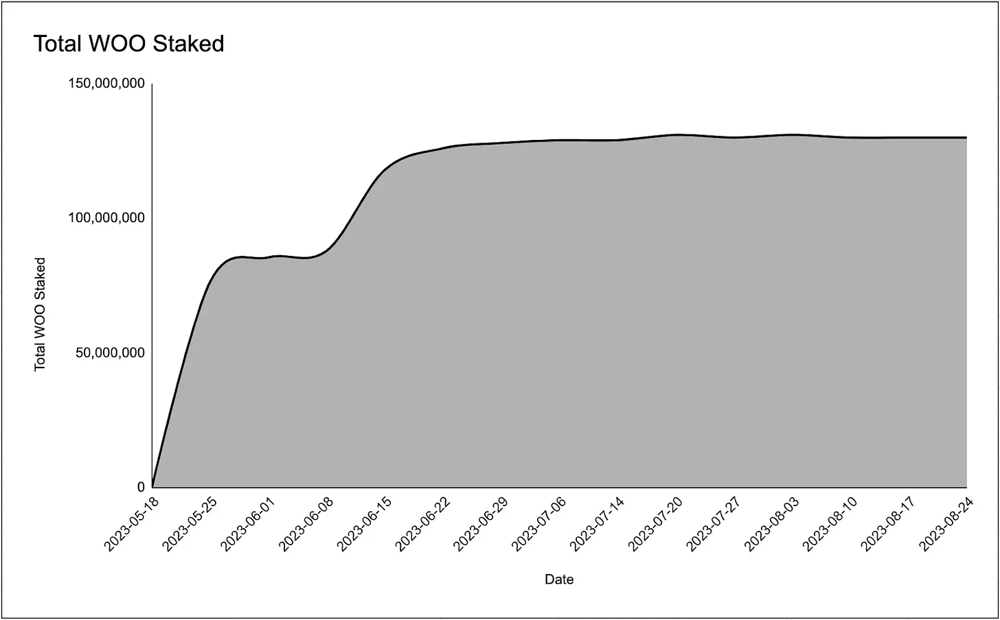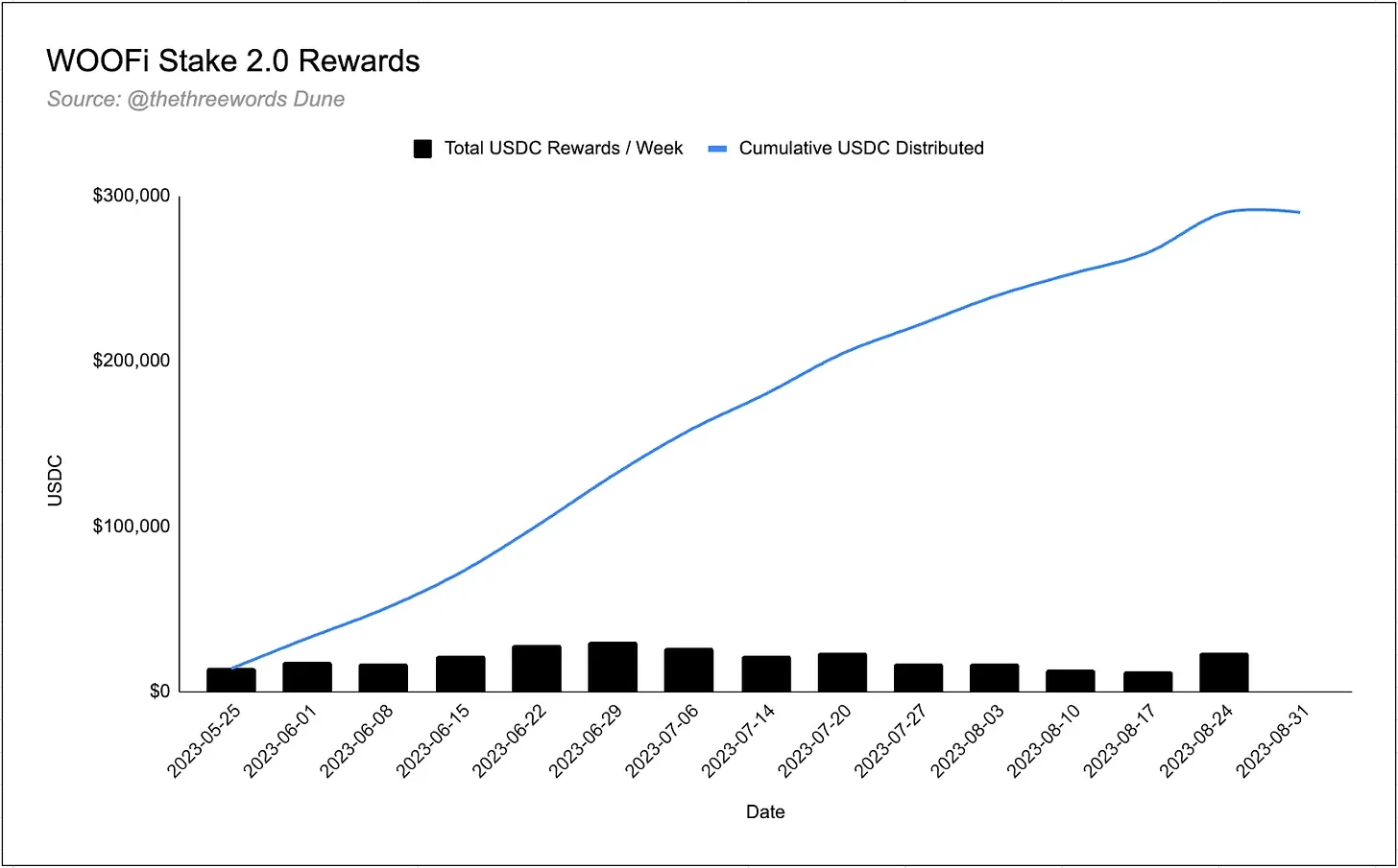 真实收益 —— 正如讨论的,当 WOO 代币被质押时,它会赚取 80% 的 WOOFi 的交换和收益费,用 USDC 支付。目前 WOO 的质押年化回报率约为 5% ,已有超过 1.3 亿的 WOO 被质押。