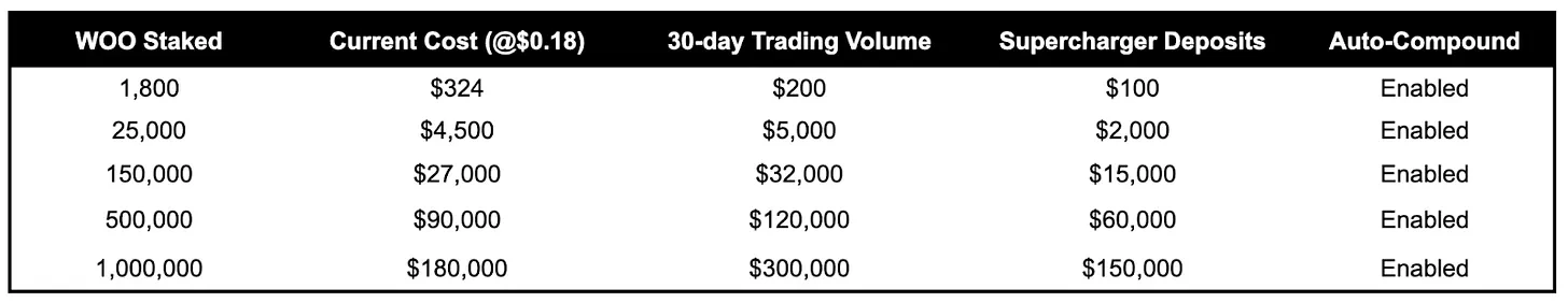 交易优惠 —— WOO 代币还从 WOO X 中心化交易所中获得实用价值。与其他交易所代币模型类似,WOO 可以被质押来解锁零手续费区域,为 CeFi 交易提供大幅度的手续费减免。其他优惠包括推荐奖金、免费提款以及永续合约和 API 交易的费用折扣。