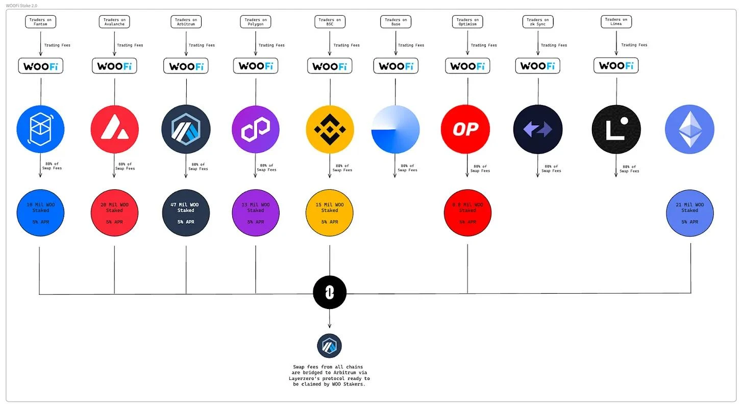 2023 年 5 月 25 日,WOOFi 交换发布了 WOOFi 质押 2.0 ,通过 LayerZero 合作伙伴关系在 Arbitrum 上实现跨链质押。