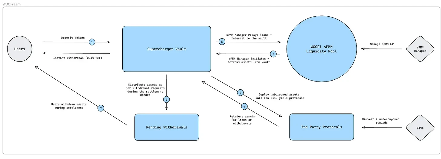 WOOFi 通过 WOOFi 挖矿界面提供 Supercharger Earn Vaults,,这是一种没有无常损失的单向收益产品。 Supercharger Earn Vaults,允许用户通过向保险库存入资产的方式,以固定的借贷利率向 sPMM 池管理者借出代币。需要注意的是,sPMM 池管理者没有为其借贷提供抵押品。本质上,WOOFi 构建了一个类似 Maple 借贷的无抵押借贷和资产支持证券产品。