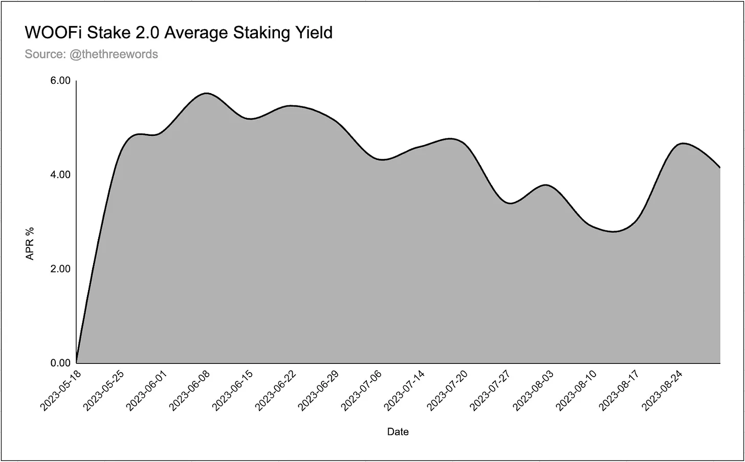 WOO 代币持有者可以通过 WOOFi 质押从这些协议费用中获益。WOOFi 质押使得用户可以在多个链上质押 WOO 并赚取协议费用,WOO 质押者的收益率一直保持在 4% 左右,奖励以 USDC 的形式发放。