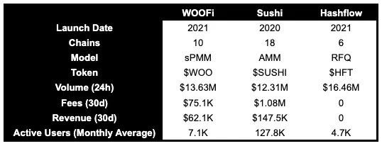 截至 2023 年 9 月,Sushi 跨越最多的链,共 18 条链,其次是 WOOFi,跨 10 条链,Hashflow 跨 6 条链。以 24 小时交易量而言,Hashflow 领先,约为 1646 万美元,其次是 WOOFi, 1363 万美元,Sushi 居尾, 1231 万美元。