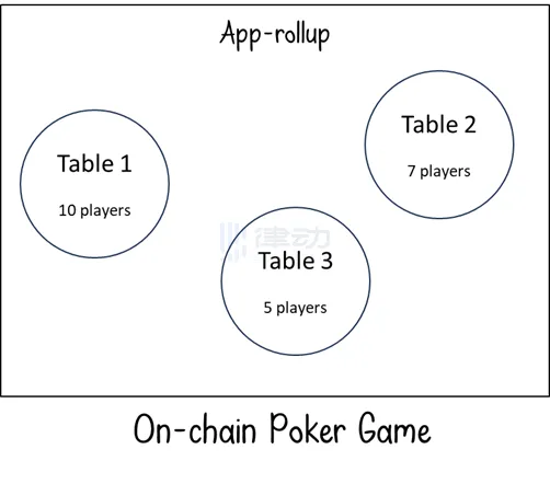 当游戏结束时,只有最终的零知识证明(ZKP)和相关的状态更改会提交到应用程序 rollup 以进行结算。这是因为中间交易(TX)不在 rollup 上处理,从而实现高达 100 倍的扩展能力。这种方法同样适用于非回合制游戏,例如《Among Us》。
