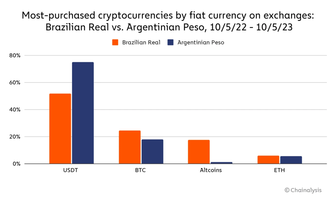 数据表明,阿根廷对稳定币 USDT 的需求远高于巴西。这是由于阿根廷最近面临的货币贬值造成的。与此同时,巴西人对比特币,尤其是山寨币表现出更高的需求,这些货币更常用于长期投资和投机。