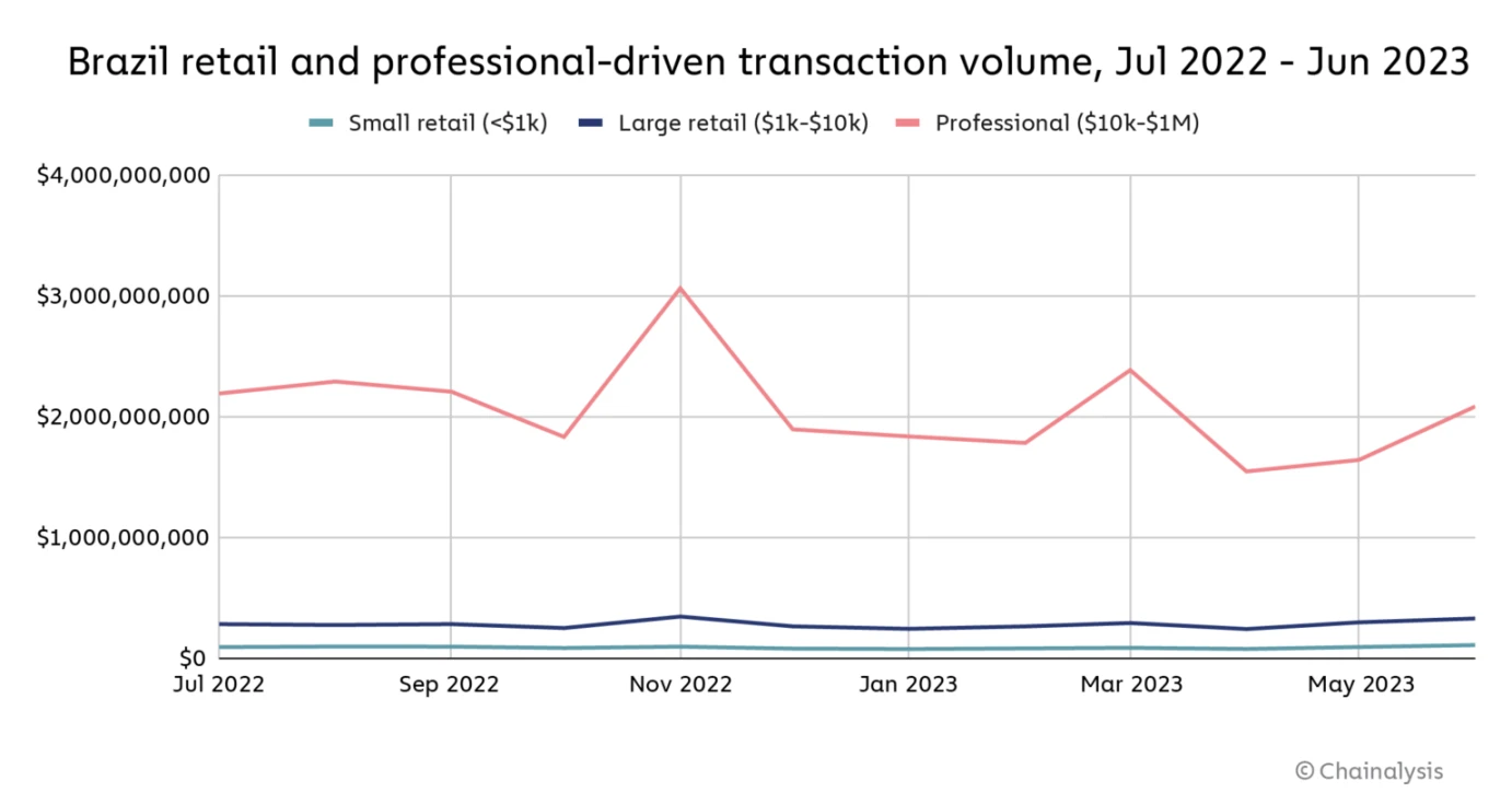 然而,对于巴西的加密货币爱好者来说,仍然有积极的一面。其一,虽然大型机构交易普遍呈下降趋势,但似乎正在回升,截至 6 月份已连续三个月增长。此外,即使在大型机构转账的下降导致加密货币活动整体下降的几个月中,专业投资者和散户的交易量也保持相对平稳,正如下面的折线图所示。