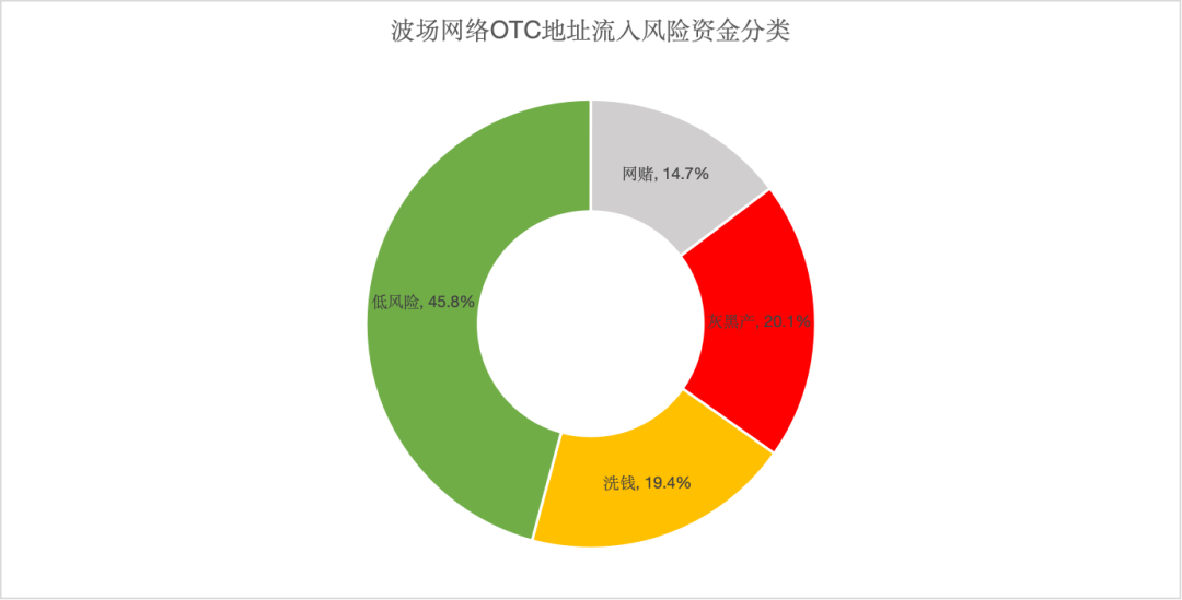 据博链财经报道,Bitrace针对明显具备OTC业务特征的波场地址进行资金分析,发现过去24个月内已有超过34.39亿USDT流入这些地址。其中,超过半数的资金属于中高风险资金,包括14.7%的网赌关联USDT,20.1%的灰黑产关联USDT,以及19.4%的洗钱关联USDT。