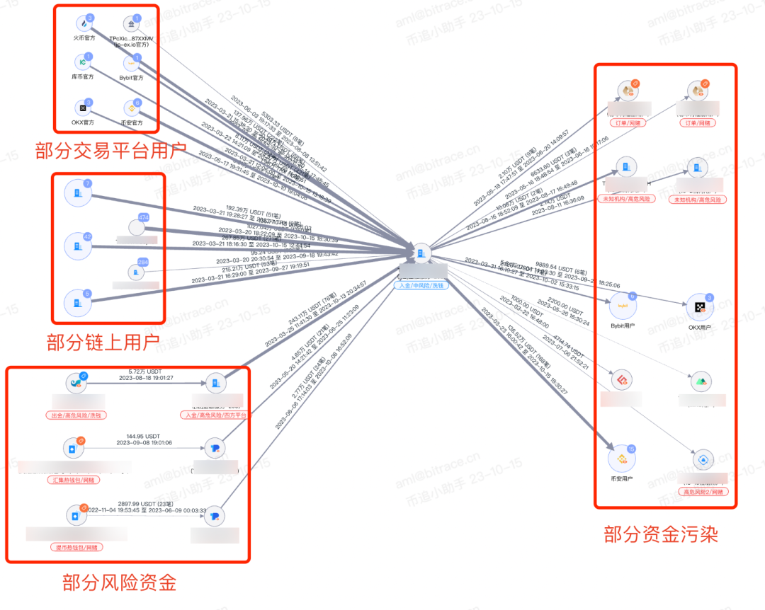 这一数据表明,收取来自这类地址及其关联地址的USDT将极有可能导致地址被污染,进而使地址资金更容易受到中心化平台的风险控制。甚至有可能引发投资者本人遭受执法部门的调查。