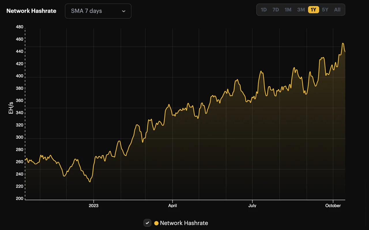 据博链财经获悉,10月16日,Bitcoin.com近日发布消息称,比特币算力创下了历史新高,七日SMA达到455 EH/s。令人震惊的是,在仅仅9个月左右的时间里,比特币算力增加了194 EH/s,接近半个ZettaHash。