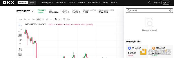 当前代币现货流动性最大的OKX,如果在亚洲区直接搜索BIGTIME,你会发现根本就搜不出结果,现货交易入口被关闭。