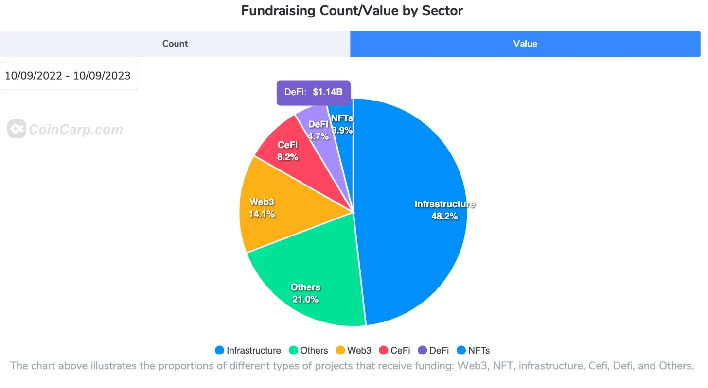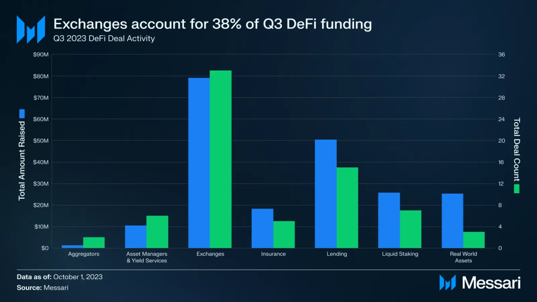 仔细观察,交易所在 DeFi 融资方面占主导地位。它们在 2023 年第三季度占所有融资的 38% 。