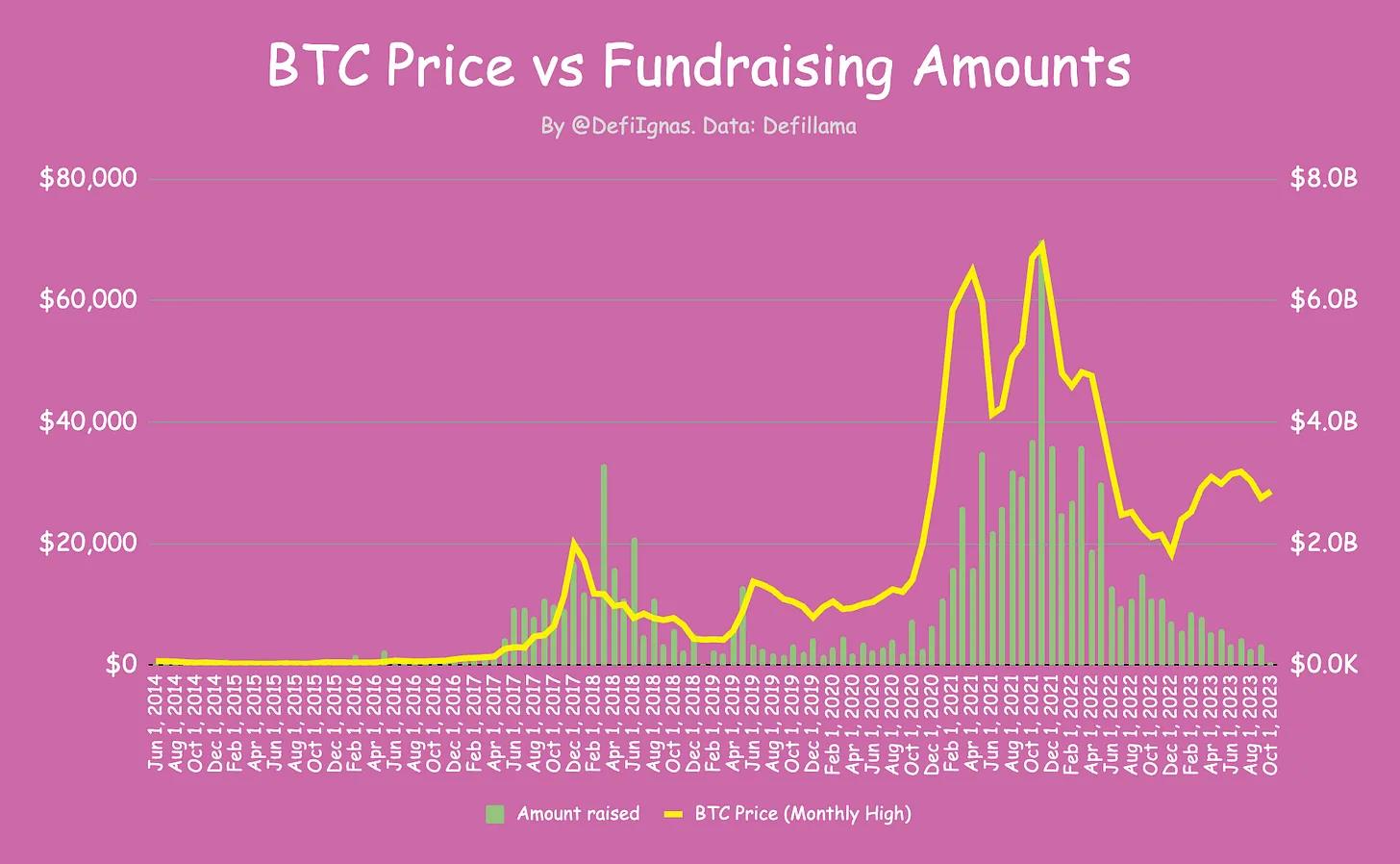 看看下面的图表。加密市场中比特币价格与筹资金额之间的相关性确实令人惊叹。随着比特币价格的下跌,筹资金额也有所下降。