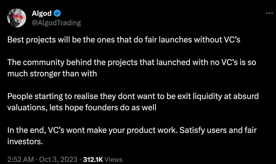 Algod 认为最好的项目将是那些在没有风险投资的情况下进行公平发行的项目,因为人们意识到他们不想成为退出流动性。在另一篇文章中,他还分享了与 2021 年相比,风险投资融资将是一个看跌的催化剂,“优先考虑社区将成为关键,项目开始意识到交易量不是由风险资本驱动的,而是由普通投资者驱动的。”