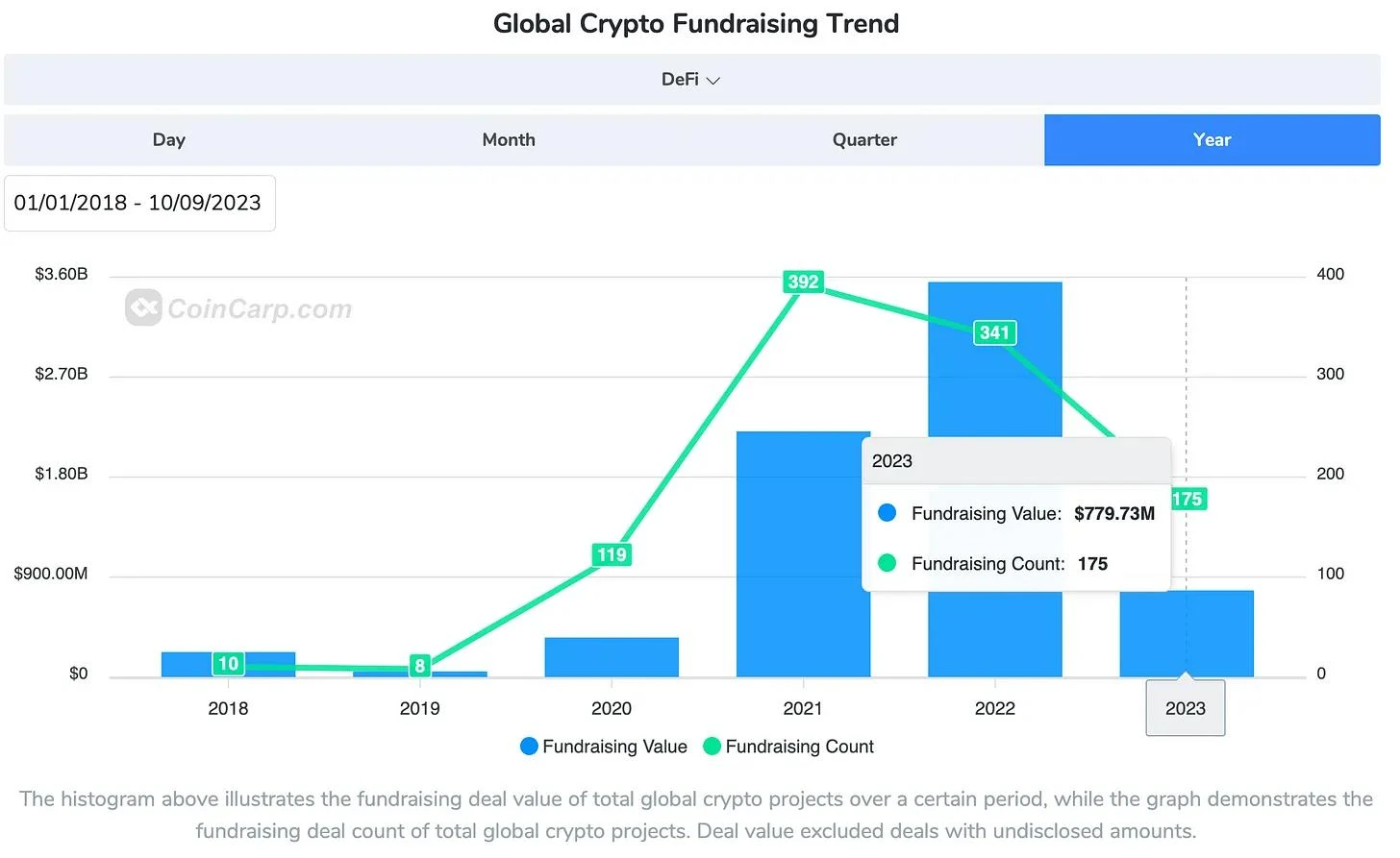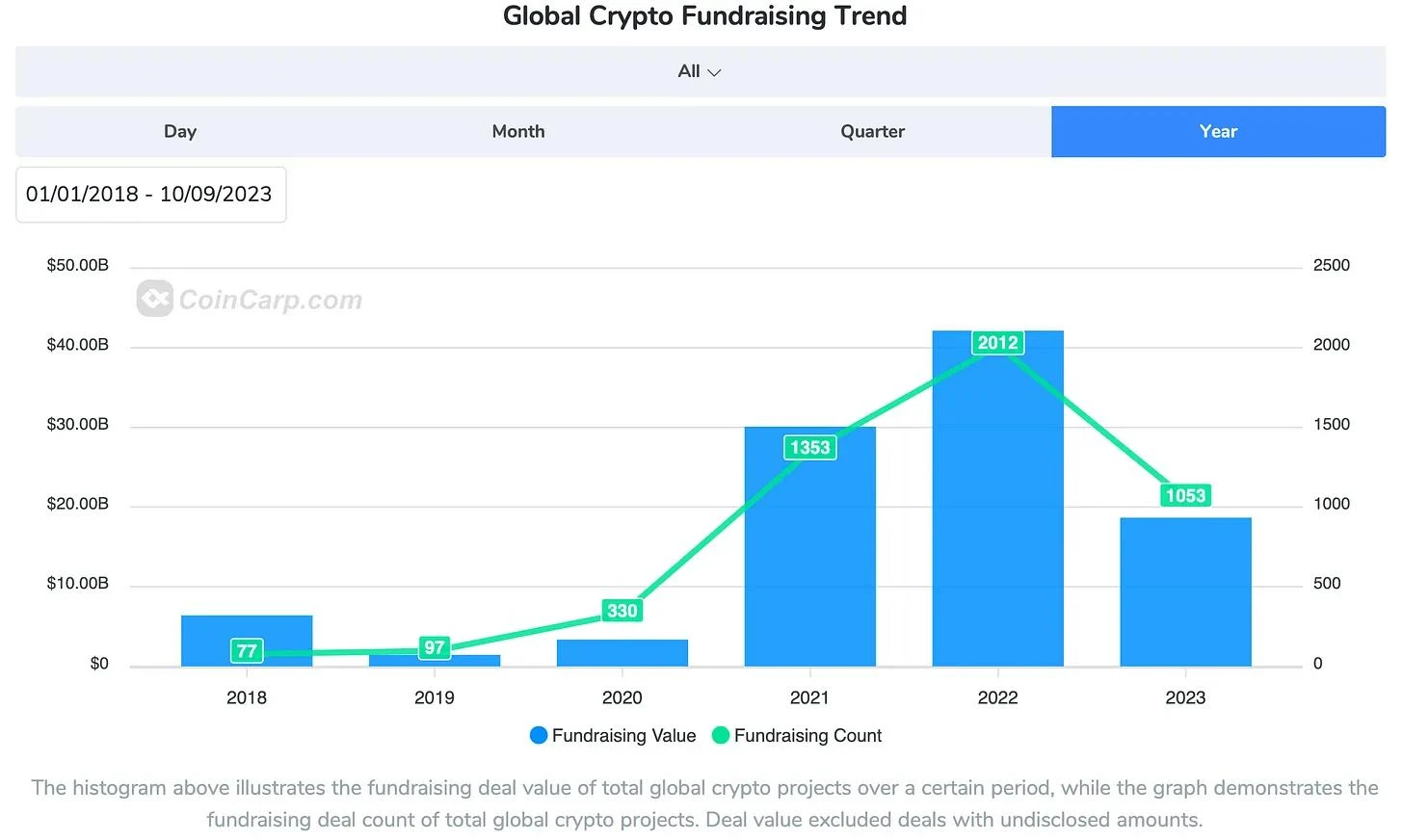 CoinCarp 提供的下图提供了不同的视角。总共 186 亿美元和 1053 笔交易,筹资情况看起来比 2020 年好得多。