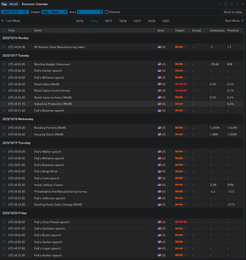 上周五(13 Oct)美国三大股指持续承压,道琼斯收涨 0.12% ,S&P 500 收跌 0.51% ,纳斯达克指数收跌超 1% 。受巴以冲突升级及市场避险情绪影响,黄金和油价在上周五分别飙升 3.5% 和 6% 。10 年期美债收益率继上周五的下跌后今日又重新攀升,目前徘徊在 4.69 附近。分析指出,导致当前收益率的上升主要的原因是美联储量化紧缩的政策,从高现金利率中获利似乎已成为目前个人投资的偏好。本周重点关注企业财报以及欧美国家的各项经济数据发布。