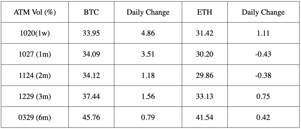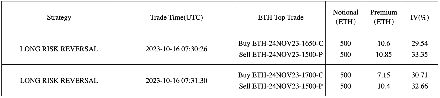 隐含波动率方面,上周五 SEC 错过重审 BTC ETF 事件被市场视为利好,并在周末短暂地将 BTC 推高至 27000 之上。该事件在今日持续发酵,午间(16 Oct 1: 00 pm UTC+ 8)BTC 价格短线再度上涨 2.5% 左右并一度站上 28000 关口, 前端波动率受此影响大幅走高 , 1 w/1 m 分别上涨 4.86% / 3.51% 达到 34% 左右的水平,十二月前的波动率曲线形状出现倒挂。