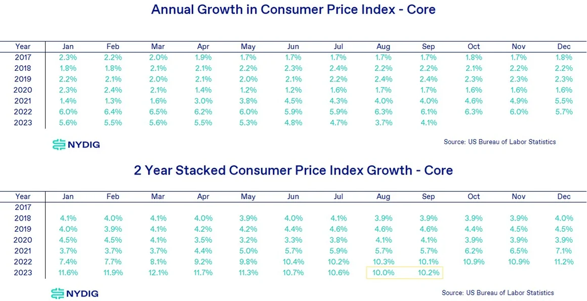 尽管通胀可能确实远离高点,但上个月的趋势并不令人鼓舞。观察 2 年期的增长(将 2 年同比回报相加,以消除年度比较中的波动)显示 9 月份略有上升,提醒我们通胀可能是一个顽固分子。