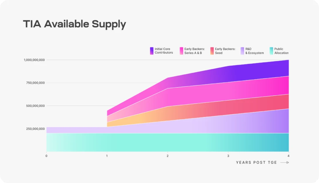 根据 TIA 的代币经济模型,在 TGE 初期,TIA 的流通供应量约为 2.67 亿枚(总供应量的 26.7% ),具体由 20% 的「公众」份额以及少部分的「研发与生态」份额组成。