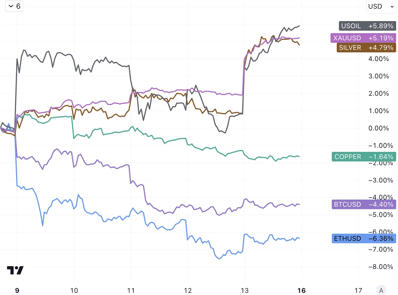中东冲突超出市场预期,有升级态势,市场在上周后半呈现明显避险态势,重新定价。期间美国 30 yr 国债拍卖遇冷,收益率一度上涨,但不敌地缘冲突影响,最终全周长端收益率明显走低,股市下跌,金银油暴涨,加密货币下跌。