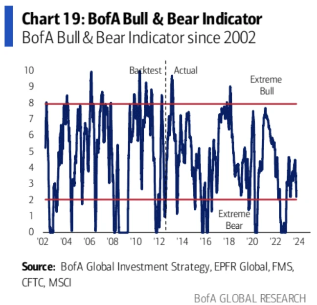 美银的牛熊指标进一步下跌至 2.2 , 2.0 以下为情绪过度悲观的买入区域: