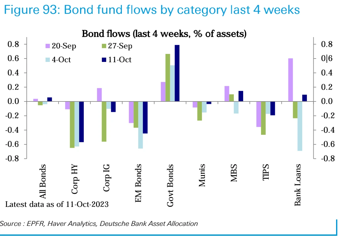 债券基金(流入 37 亿美元)在过去两周净流出后转为净流入,主要由于政府债券(流入 72 亿美元)净流入加速至三个月新高推动: