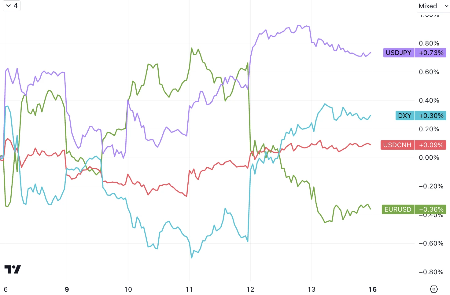 美元仅仅回调了一周,上周强势反弹,DXY 回到 106.6 上方,USDJPY 在 150 整数位附近持续高位震荡: