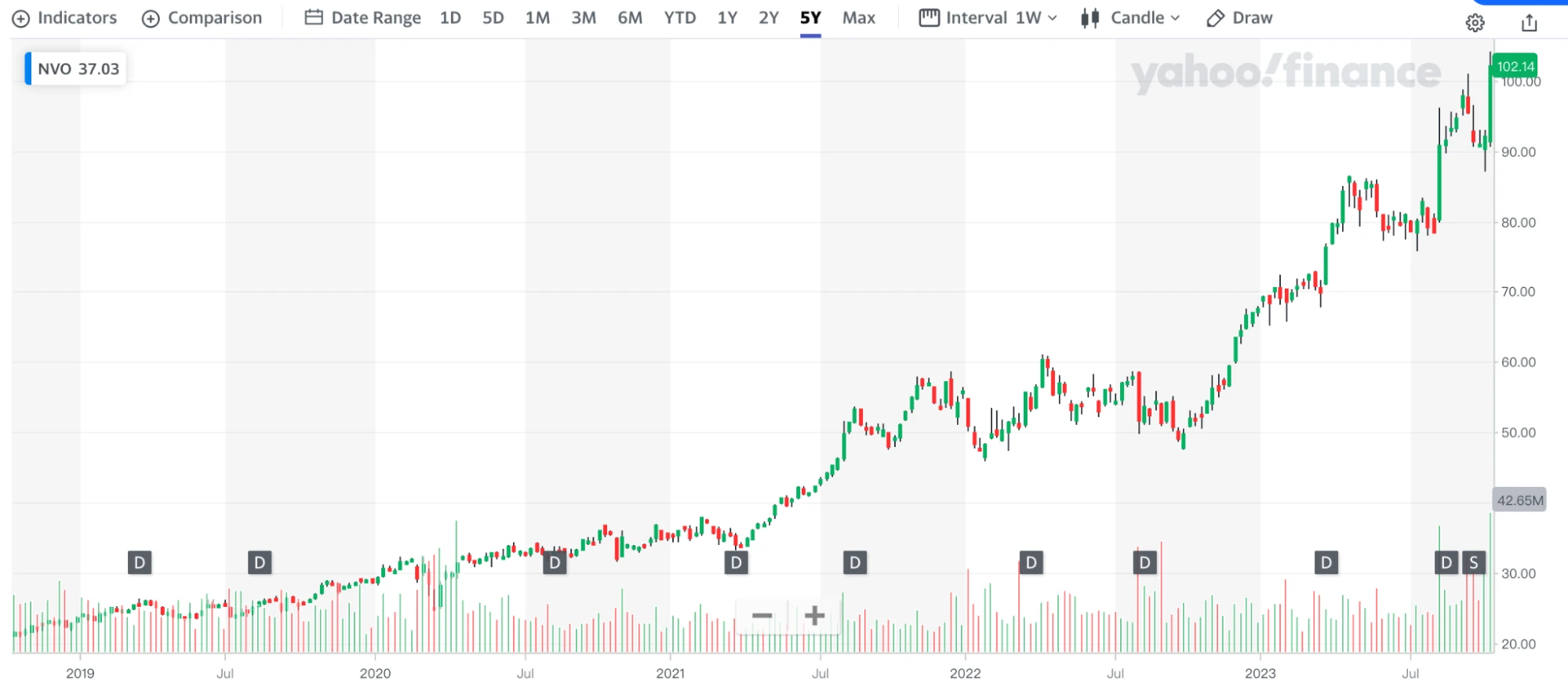 “减肥神药”实在太火,诺和诺德上周年内三次上调预期,将全年营收增长预期从此的 27 – 33% 上调至 32% -38% ,并将税前利润 (EBIT) 增长预期从此前的 31 – 37% 上调至 40 – 46% ,分析师预期为增长 37.5% 。受此影响,诺和诺德股价一度大涨逾 5% ,创下历史新高,年初至今涨近 50% 。市值超过奢侈品巨头 LVMH,成为欧洲最有价值的公司。