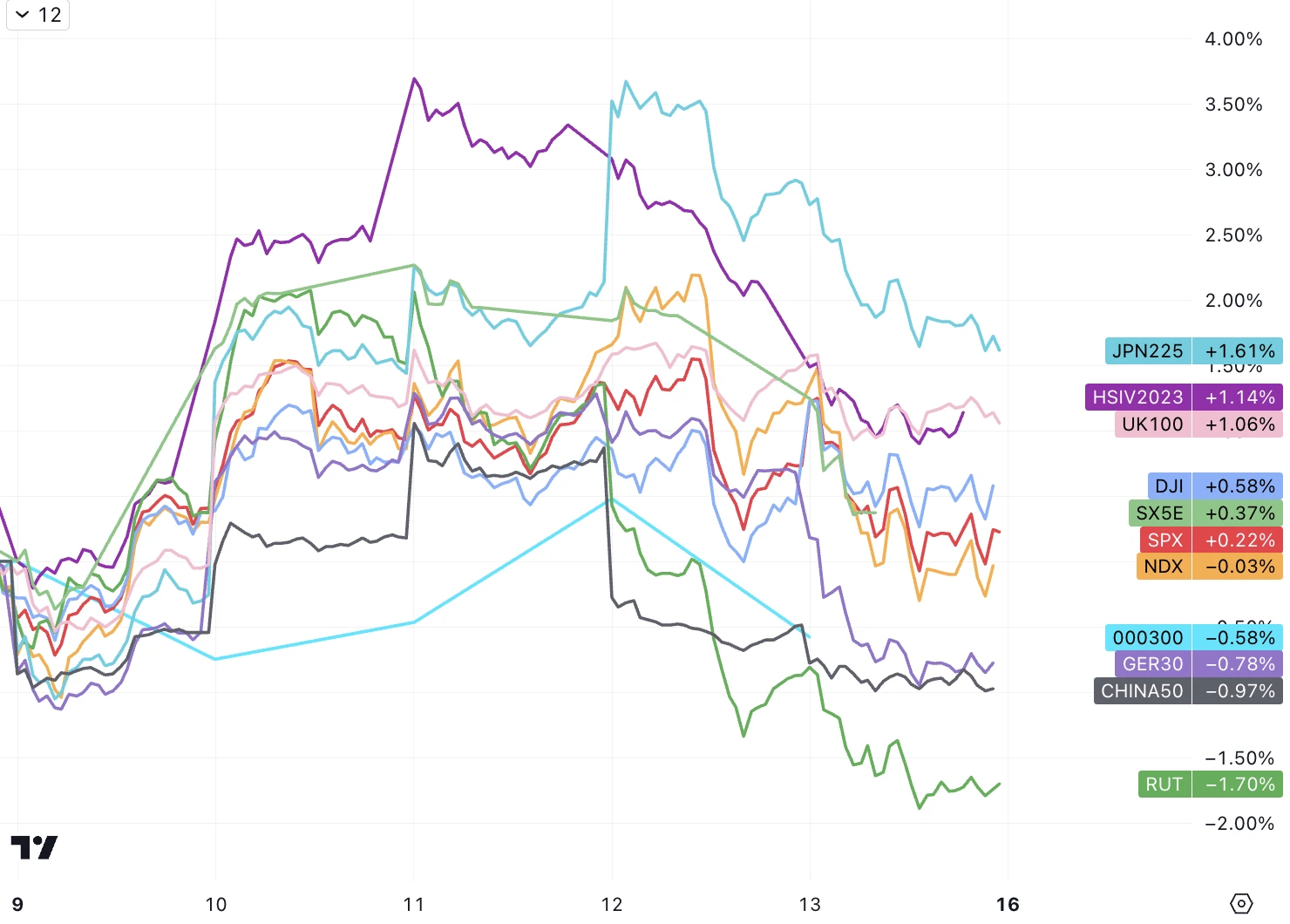 全球股市方面,正如我们前周晨会提到的一样,股票市场在前半段并未对巴以冲突予以过多考虑,仍在消化多位 Fed 官员口吻转鸽的积极影响,整体上涨。周四周五期间叠加美国 30 yr 拍卖遇冷、CPI 略超预期、初请失业金人数优于预期、通胀调查预期上升、巴以冲突没有向好的方面发展反而进一步升级等影响大跌,但日股、美股、港股全周仍然收涨: