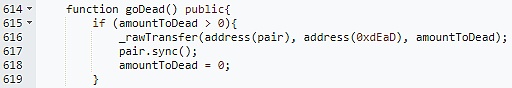 但是合约没考虑到一些特殊情况,例如直接向pair里面转币,这时会使得合约误以为用户是在卖币,这部分币可以通过pair的skim函数全部提取出来。相当于pair没有任何变化,再次调用goDead()函数时,却能使得pair中的代币意外减少,重复操作,便能耗尽pair其中一种代币。