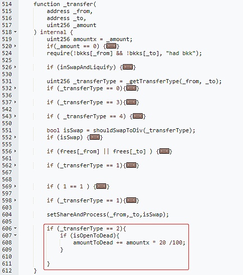 再以另一个意外销毁pair代币的例子说明一下,如下图代码。合约会判断当前交易类型,如果为2(to地址为pair合约,相当于卖币),合约会记录一个交易量的20%作为销毁数量,后续可以调用goDead()函数将pair中这个累积数量销毁,该功能对稳定币价能起部分作用。