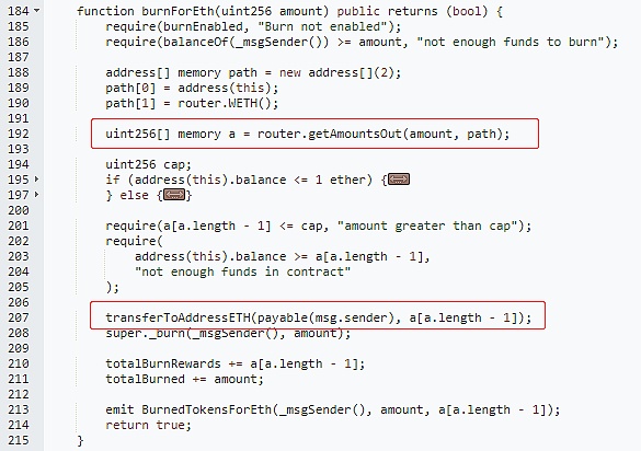 burnForEth函数通过依赖pair中能兑换出的数量来作为本合约发送给调用者的ETH数量,该数量是通过pair中两种代币余额来进行计算。正常情况下这是一个最准确的价格,但是如果提前使用ETH将pair中的另一个代币大量兑换出来,会导致ETH在该pair中的价格暴跌,从而计算出能兑换的ETH就会异常大,使得合约给调用者发送更多的ETH。最后,调用者通过pair将ETH兑换回来,使价格恢复正常。