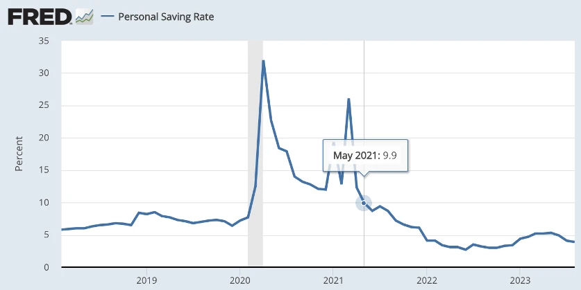 这种心态转变导致了储蓄率从 26.1% 在两个月内跌到不到 10% 。以下是以 2021 年 5 月为参考的储蓄率,这是 2021 年夏天狂欢的开始...