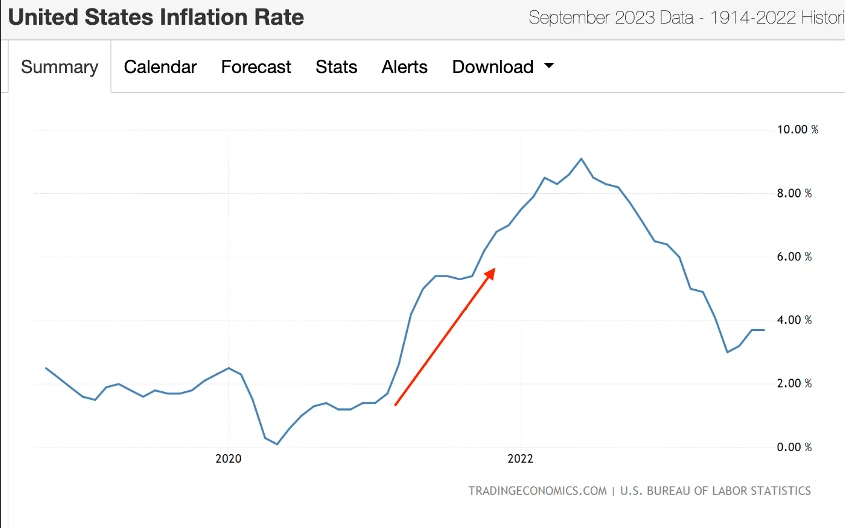 这是图表上的通货膨胀。我猜您能看出红色箭头突出显示的是哪个时期 —— 2021 年夏季。
