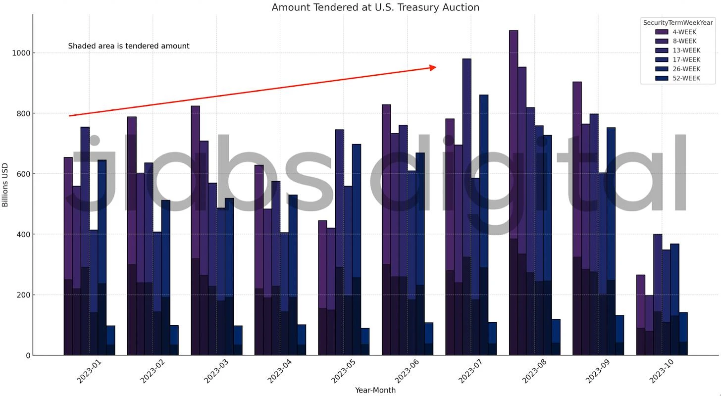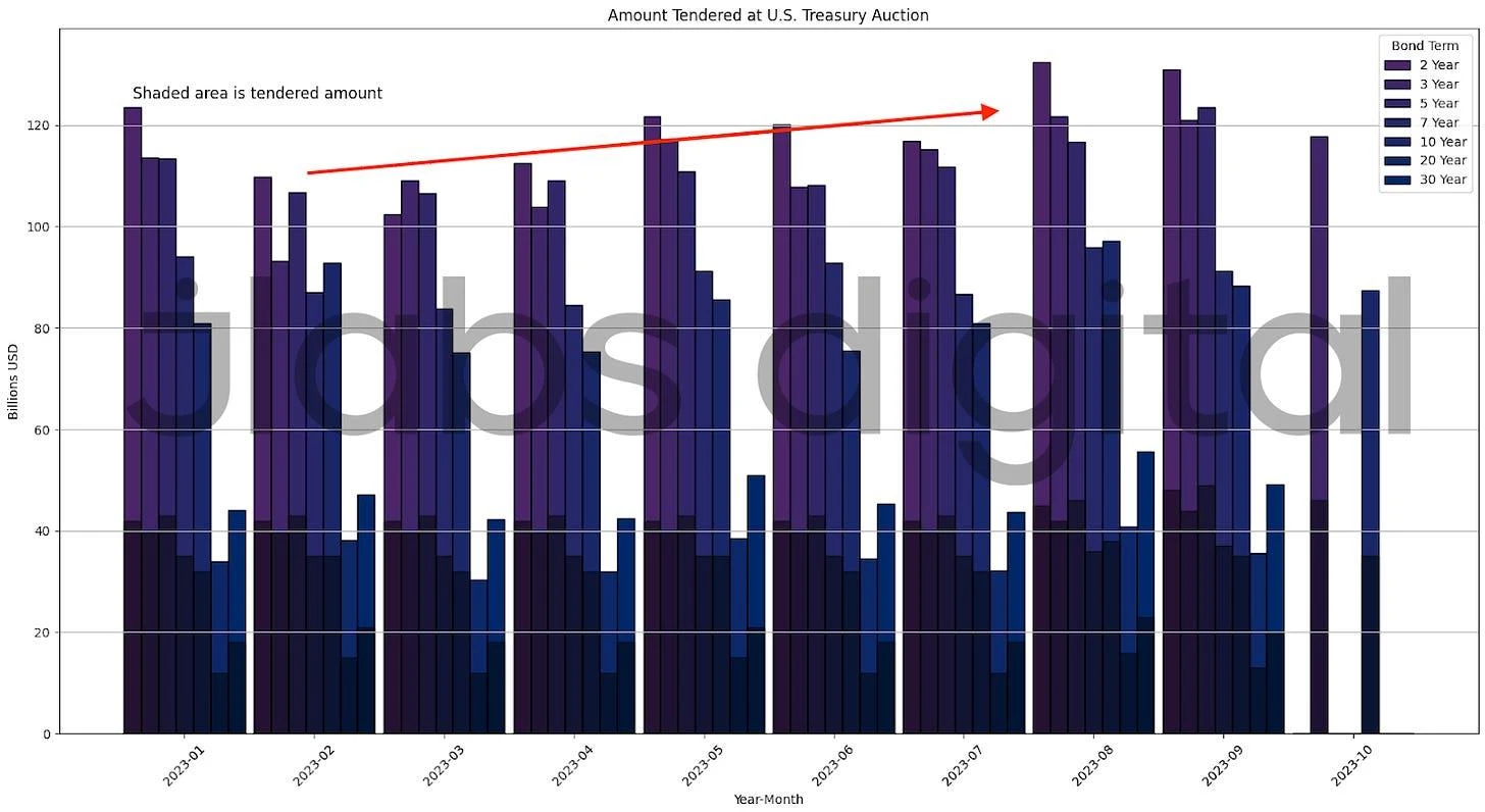 我们可以根据国债市场上升的需求来看到这一点。在下面的图表中,每一条彩色线代表一个美国国债期限。线的高度是每个月每个期限的投标金额。每个柱的阴影区域是美国财政部授予的投标数量。