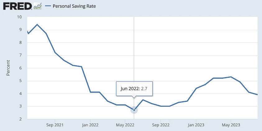 下面是上面的储蓄率图表,更多地关注在 COVID 后的时期。我们可以看到图表在 2022 年 6 月达到最低点——也就是通货膨胀率达到峰值的同一个月。