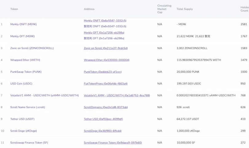 根据 Blockscout Scroll 主网 Token 页面,若参考当前持有地址数最多的 Token,受关注的项目包括 Merkly、 Zonic on Scroll、PunkSwap Token、Skydrome、Scroll Name Service、Scroll Doge (zkDoge)、Scrollswap Finance Token (SF)、Script (SCRIPT) 、Scroll Inu. (Sinu)。