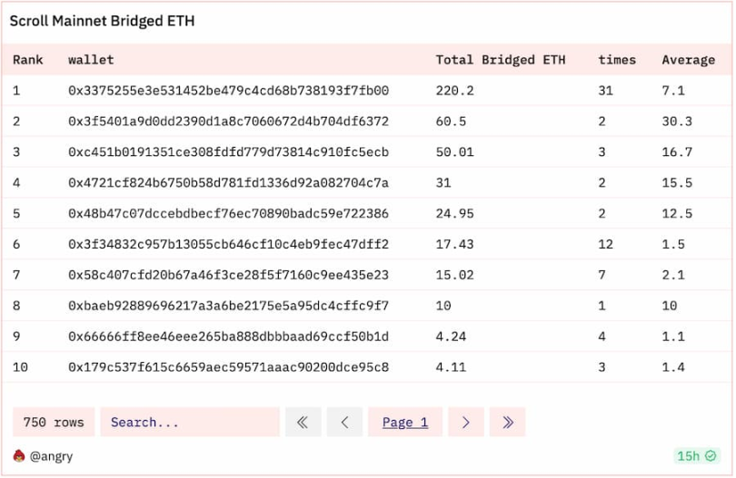 截止 15 小时之前,跨链独立地址 有 795 个,其中, 0x3375255e3e531452be479c4cd68b738193f7fb00 地址通过 31 笔跨链交易存入 220 枚 ETH(约合 35 万美元),占到跨链总量的 40% 以上。