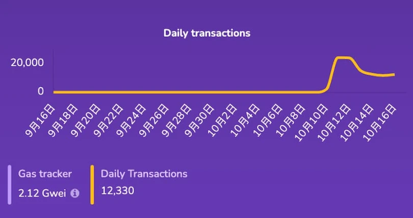 首先我们来看 Scroll 主网交易情况。根据 Blockscout 数据 ,已验证交易当前突破 10 万笔(包括合约调用、交易、转账、铸造等),截止今日撰稿时为 101, 916 笔,日均交易笔数为 12, 330 笔,而钱包地址数超过 1.8 万个。
