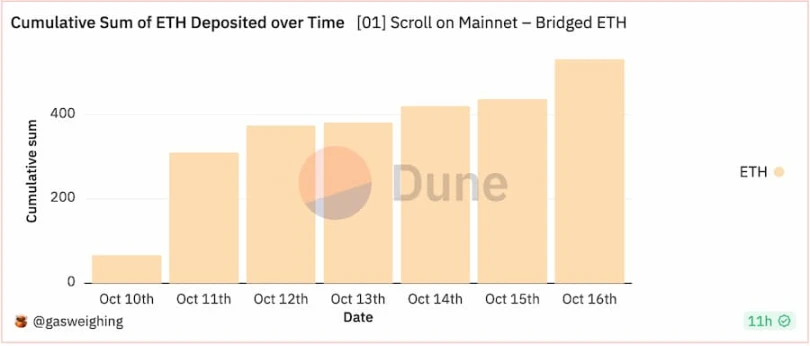 根据 Dune 数据 ,当前跨链到 Scroll 主网的 ETH 有 532 枚 ETH,约合 84 万美元。Scroll 主网启动第二天,即 10 月 11 日跨链过来的 ETH 最多,达到 243 ETH,后面几日的单日跨链 ETH 数量在数十枚左右。