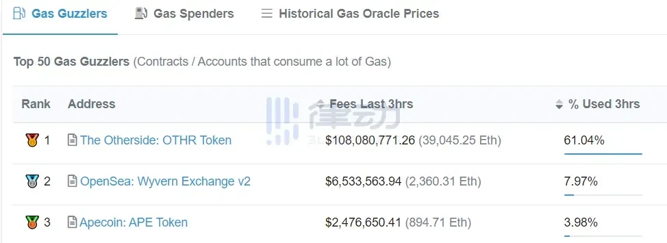 Otherside 正式 启动 于北京时间 5 月 1 日零时,Otherside 铸币活动一度导致 Etherscan 无法访问。据 etherscan 数据 显示 ,从北京时间 5 月 1 日早上 9 点开始,过去三小时 The Otherside 上 OTHR Token 产生的 Gas 费用近 4 万 ETH,超 1 亿美元,占到以太坊全网 Gas 费用的 61% 。