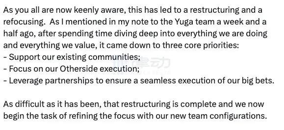 10 月 18 日, Yuga Labs 首席执行官 Daniel Alegre 发表了一篇长推,表示公司的重组已经完成。